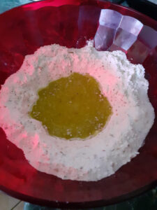 Create a dough with all of the ingredients and let it rise for 2 hours in a closed bowl.
