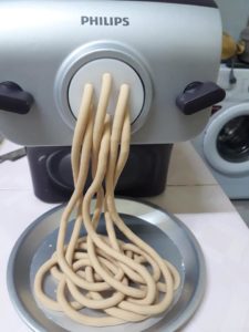 Put the dough into the machine, start it for mixing and extruding